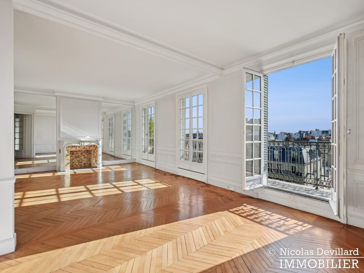 Avenue Bosquet, à deux pas de la rue Cler et de l’Ecole Militaire, cet appartement ensoleillé et bordé de larges balcons surplombe les arbres de l’avenue et offre de très belles vues sur les monuments. Situé au 6ème étage avec ascenseur d’un très bel immeuble pierre de taille haussmannien, il se compose d’une entrée, un vestibule ovale desservant les 3 pièces de réception ouvrant sur le premier balcon et offrant une vue plein ciel sur le dôme des Invalides, cuisine semi-ouverte dans la salle à manger, un bureau et 4 chambres sur cour, ouvrant également sur un balcon et offrant une vue sur la Tour Eiffel, dressing dans la master suite, placards intégrés dans les autres chambres, 3 salles de bains (1 avec baignoire et douche, 1 avec baignoire, 1 avec douche), grande lingerie, 3 wc. Une cave. Les pièces de réception exposées Est et bordées par un large balcon filant surplombent l’avenue Bosquet et le dôme des Invalides ; le bureau et les 4 chambres, bordées également par un large balcon filant donnent sur la cour intérieure et la vue Tour Eiffel.