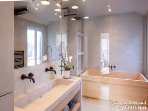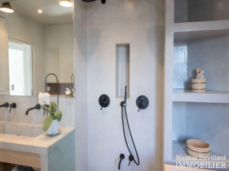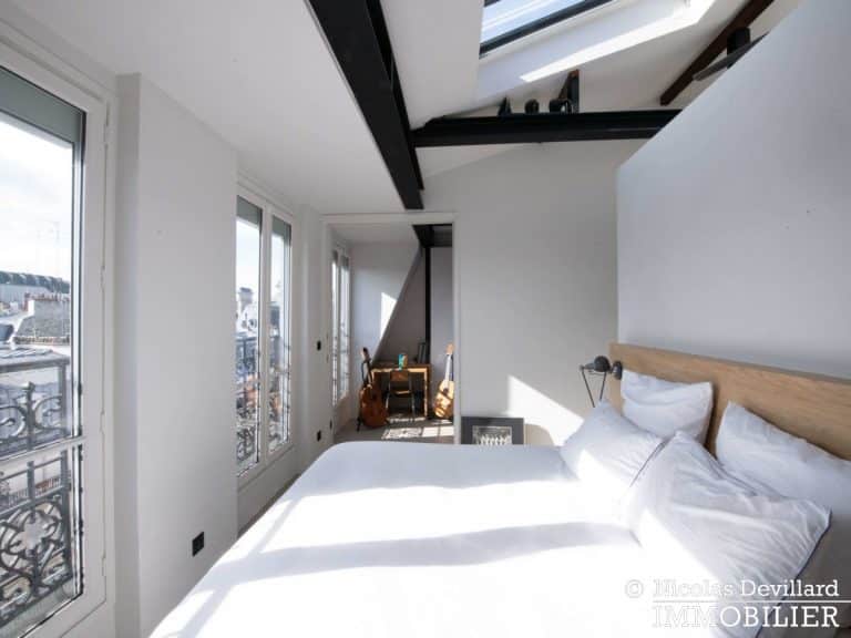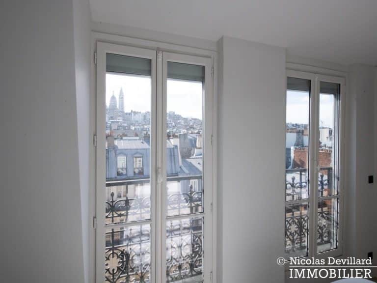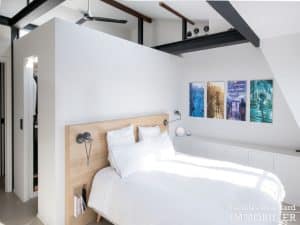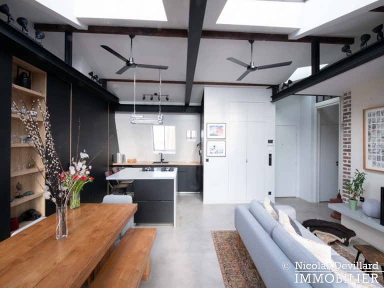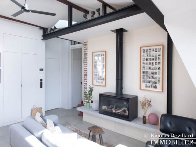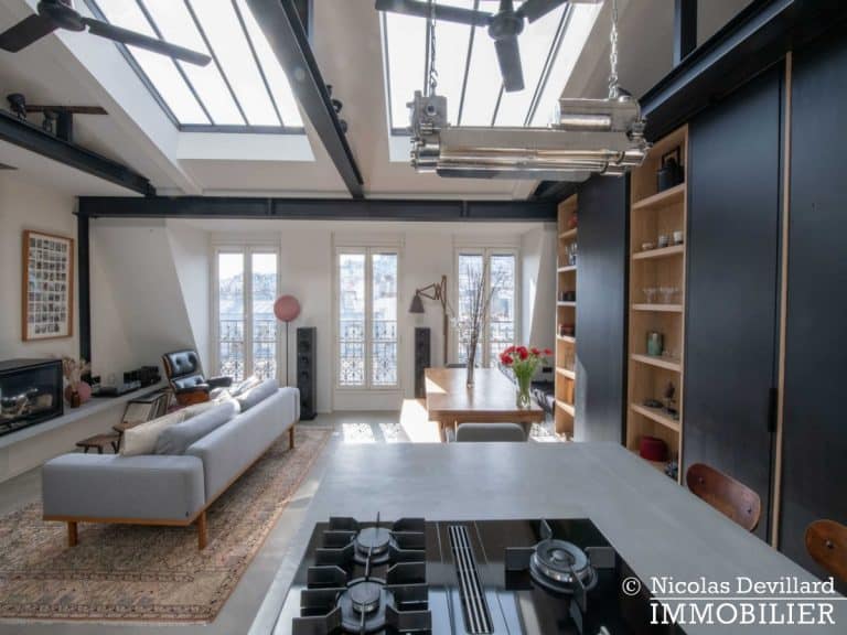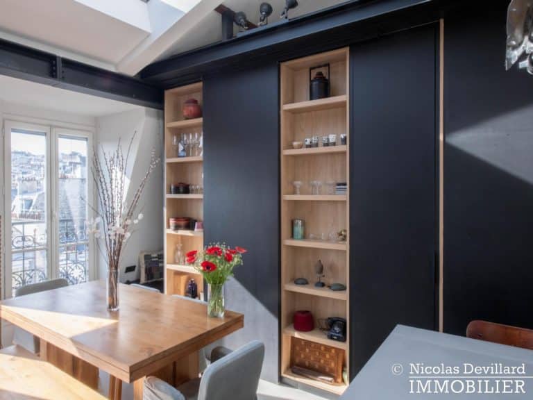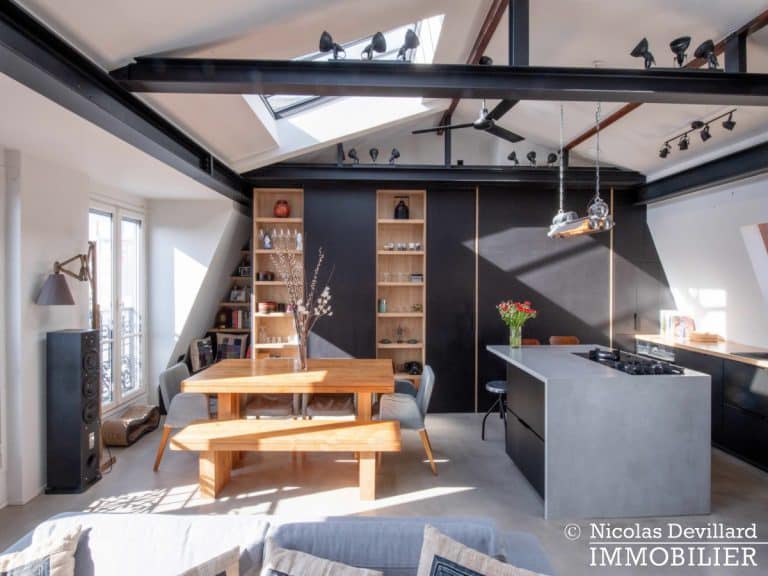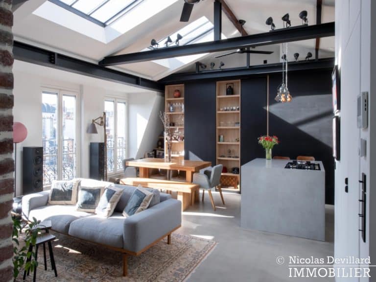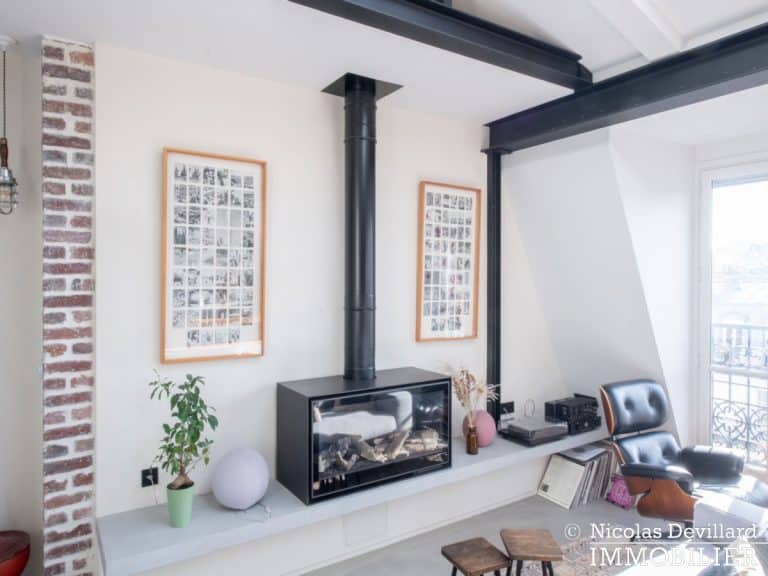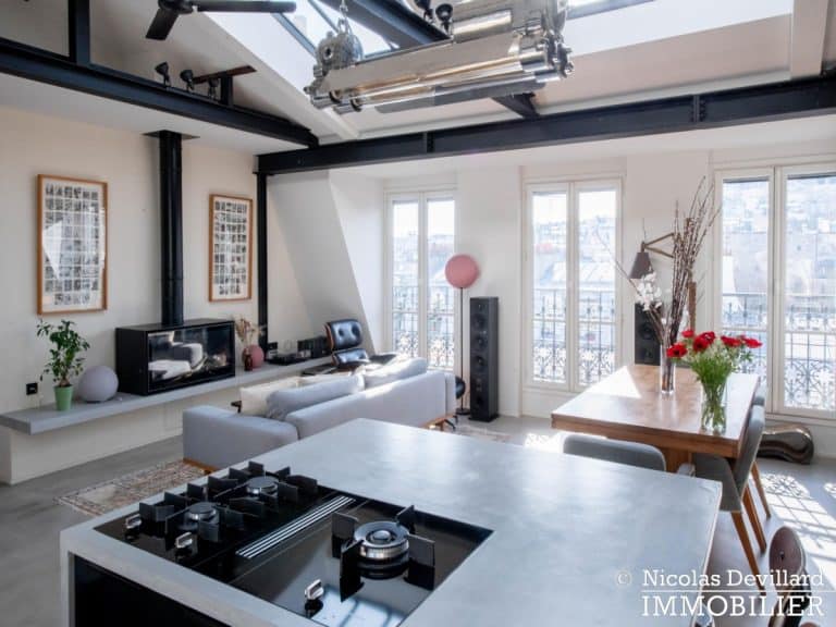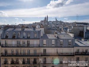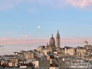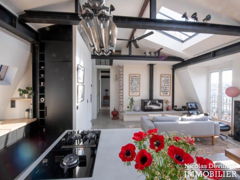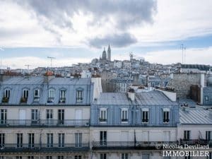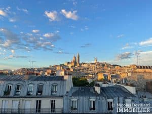 Dans le vivant quartier de la mairie du 18ème, à deux pas du métro Jules Joffrin, cet appartement rénové au dernier étage bénéficie d’une vue spectaculaire, d’un ensoleillement important et de prestations de qualité. Situé au 7ème et dernier étage d’un bel immeuble pierre de taille (avec ascenseur jusqu’au 6ème), cet appartement aux allures de loft industriel se compose d’une superbe pièce principale de 40 m² dotée de 4 fenêtres et 2 verrières offrant une vue spectaculaire sur le Sacré-Cœur, la butte Montmartre et les toits parisiens typiques. Cette pièce est dotée d’une cheminée à gaz et abrite aussi une superbe cuisine avec îlot central et entièrement équipée Miele. Un dégagement mène au 3 chambres, dont 1 master avec grand dressing. Une salle de bains avec une double douche, un wc séparé équipée de toilette japonaise, un espace avec lave-linge et sèche-linge séparés de marque Miele.