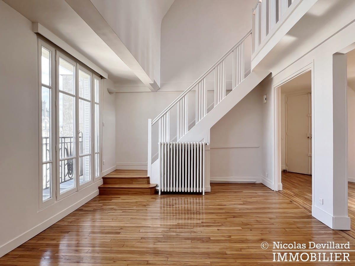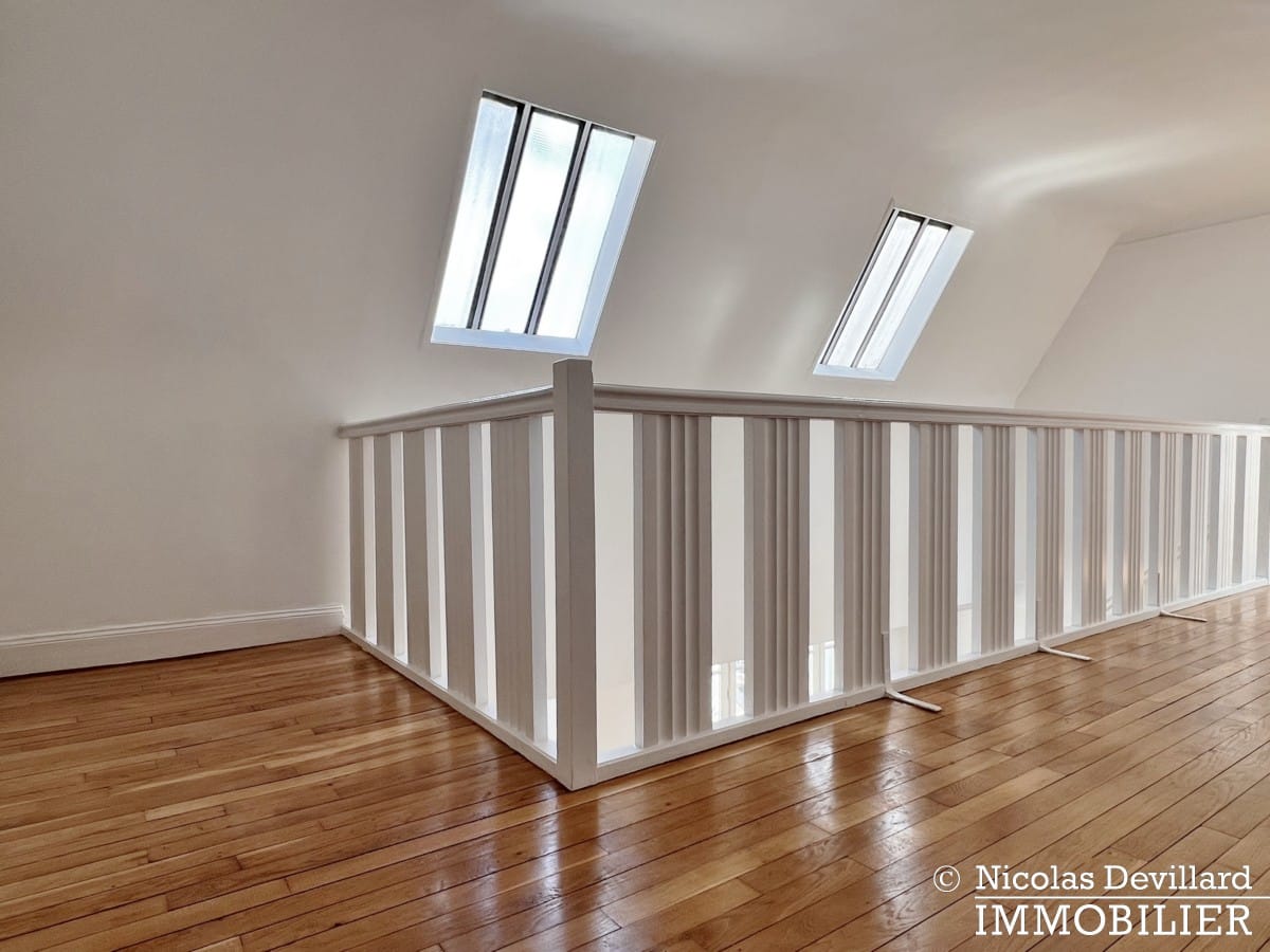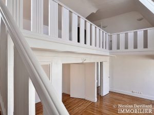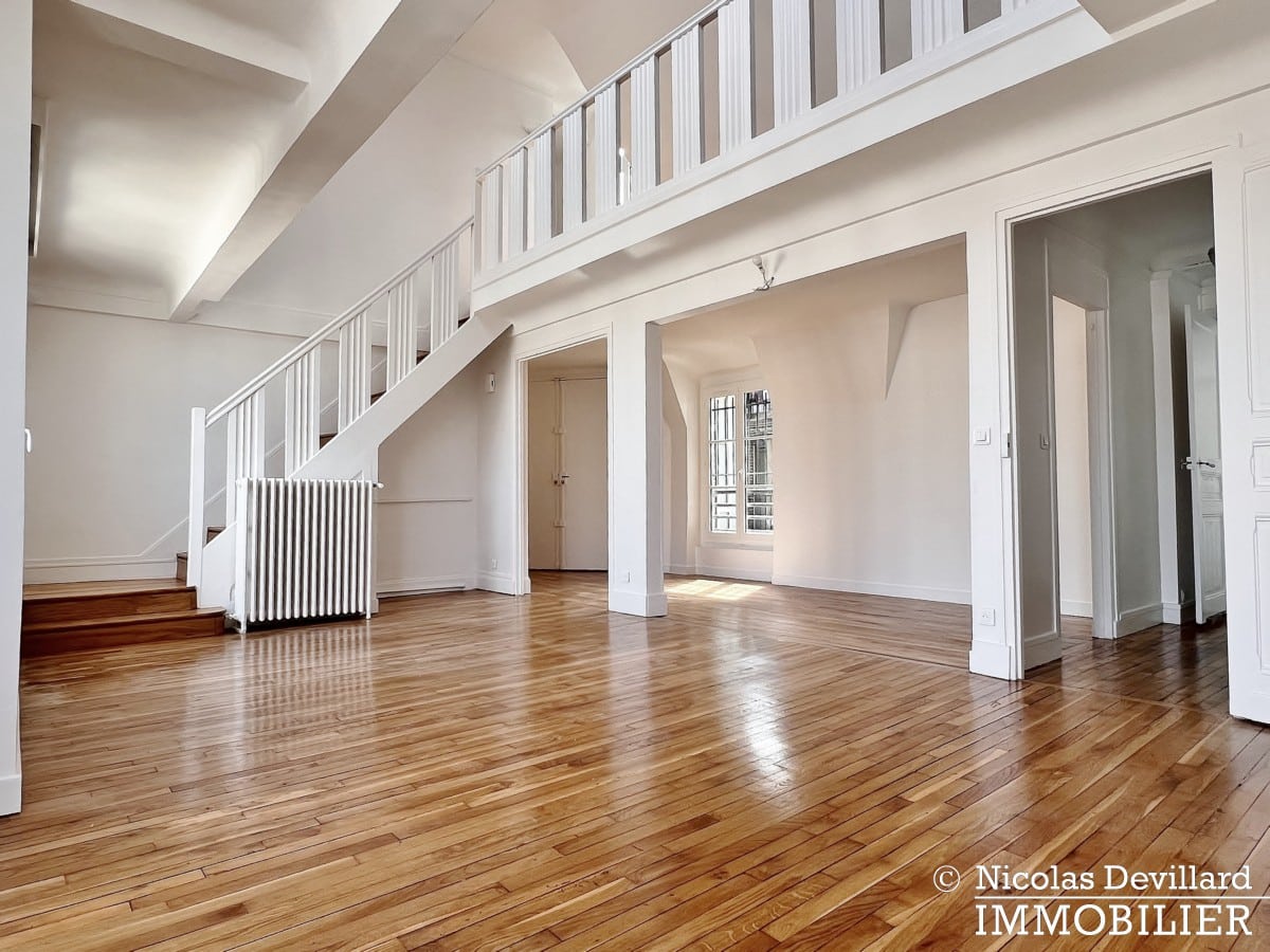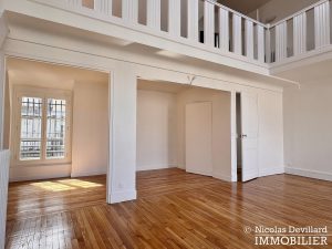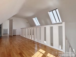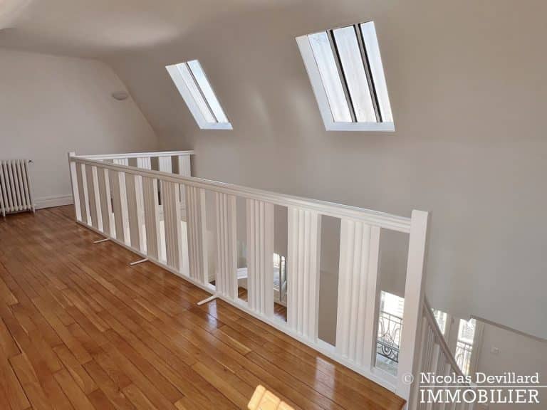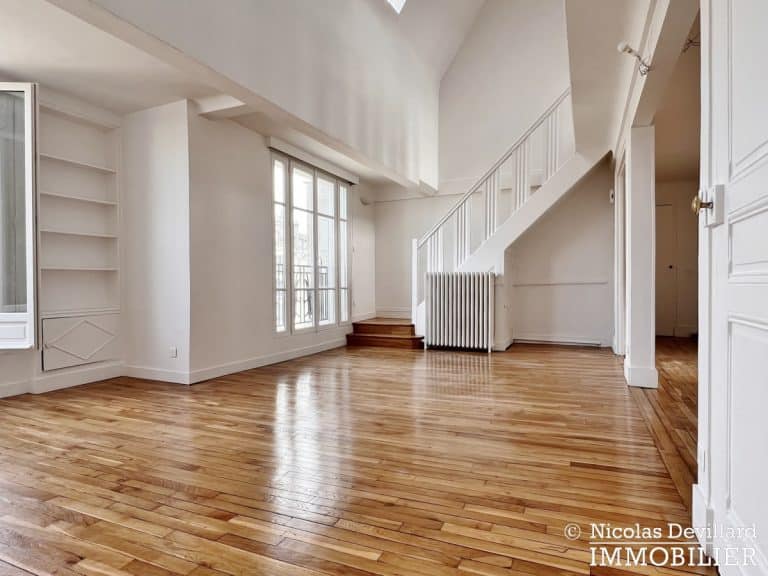 Dans le quartier de la Muette, à proximité de la rue de Passy et de ses marchés, et proche du parc de Passy, ce duplex rénové au dernier étage bénéficie d’une lumière abondante et de volumes hors du commun. Aux 7ème et 8ème étages avec ascenseur d’un immeuble pierre de taille 1930 de standing, il se compose d’une entrée, un salon double très haut de plafond et ouvrant sur un balcon, 3 chambres, une mezzanine-bureau, une cuisine aménagée, 3 salles de bains (1 avec baignoire, 2 avec douche), 2 wc, une cave. 1 parking dans l’immeuble.